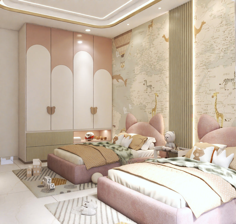 A contemporary 2BHK residential apartment styled with a soothing pastel color palette.